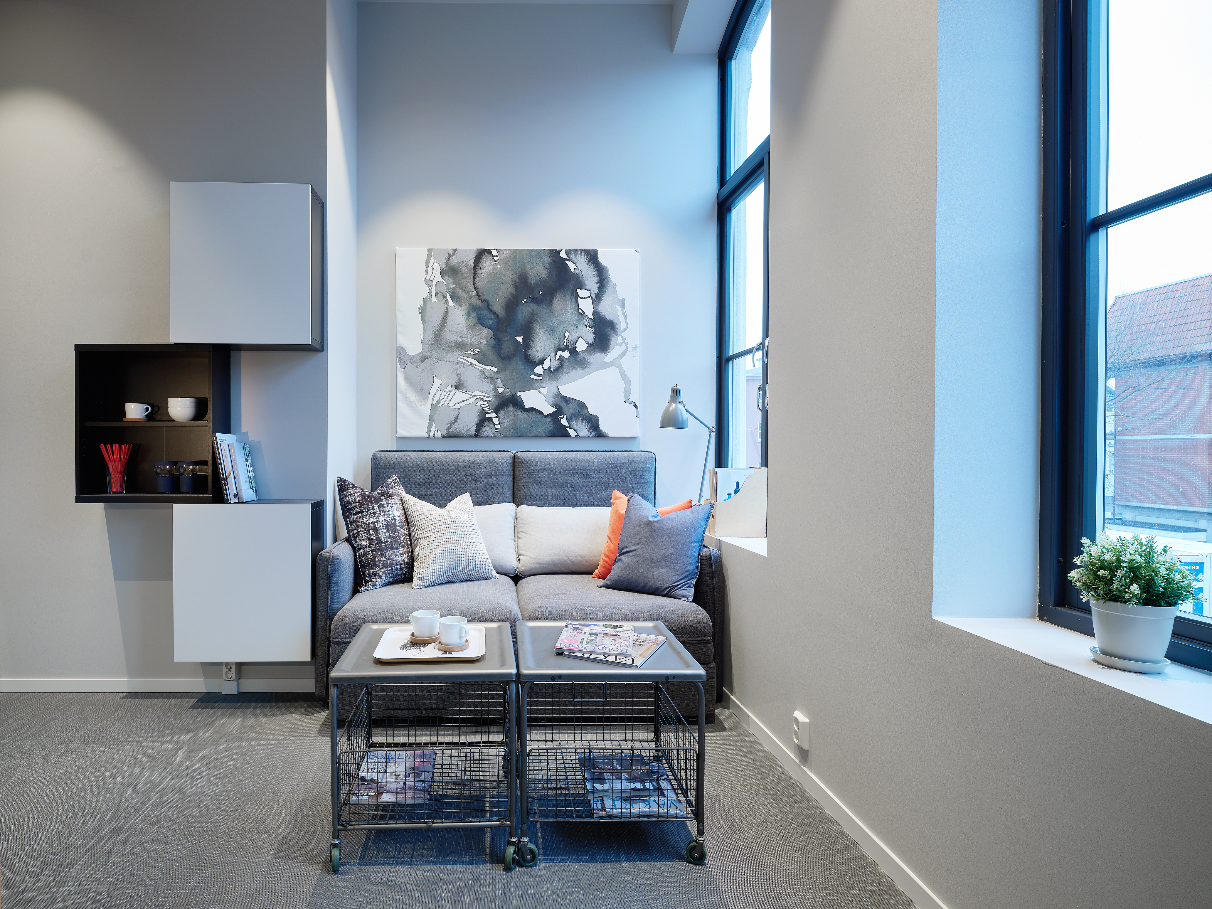 Studioleilighet med 1 stort vindu og enorm takhøyde. Topp standard på bad og vannbåren varme i alle gulv. Komplett kjøkken med alt du trenger for å lage deilige middager. Praktisk oppbevaring i skap over og rundt TV. Koselig sofakrok med sovesofa, for de gangene du trenger det. Dette er leiligheten for deg som ønsker å bo godt alene.